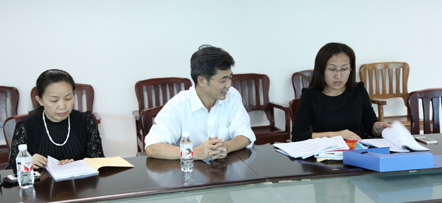 文化厅直属机关委员会“三严三实”第四督查组组长梁晓(中)、副组长周敏(左)、联络员闫雪梅仔细查看学校开展专题教育情况材料