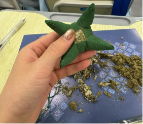 课程伊始,老师们系统讲解了麽乜的历史渊源、文化内涵与传统制作工艺。其中,“香囊配方”图谱清晰展示了防流感、驱蚊等不同功效的药材组合,生动呈现了这一融合医药智慧与民俗记忆的非遗项目。在老师的细心引导下,同学们仔细观察艾草、薄荷等天然香料,了解了其药用价值与一些配比技巧。蓝底花纹的工作垫上,经过配比、混合的干枯草药与细腻药粉散发出阵阵自然清香,悄然唤醒沉睡的嗅觉记忆。