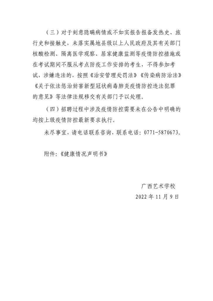 广西艺术学校2022年公开招聘考试考生防疫须知 时间:2022-11-09 10:39:08 来源:广西艺术学校 作者:办公室 浏览:次 分享到: 附件:健康状况承诺书.doc 点赞 收藏 打印正文 关闭本页