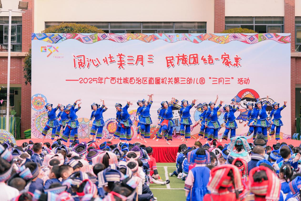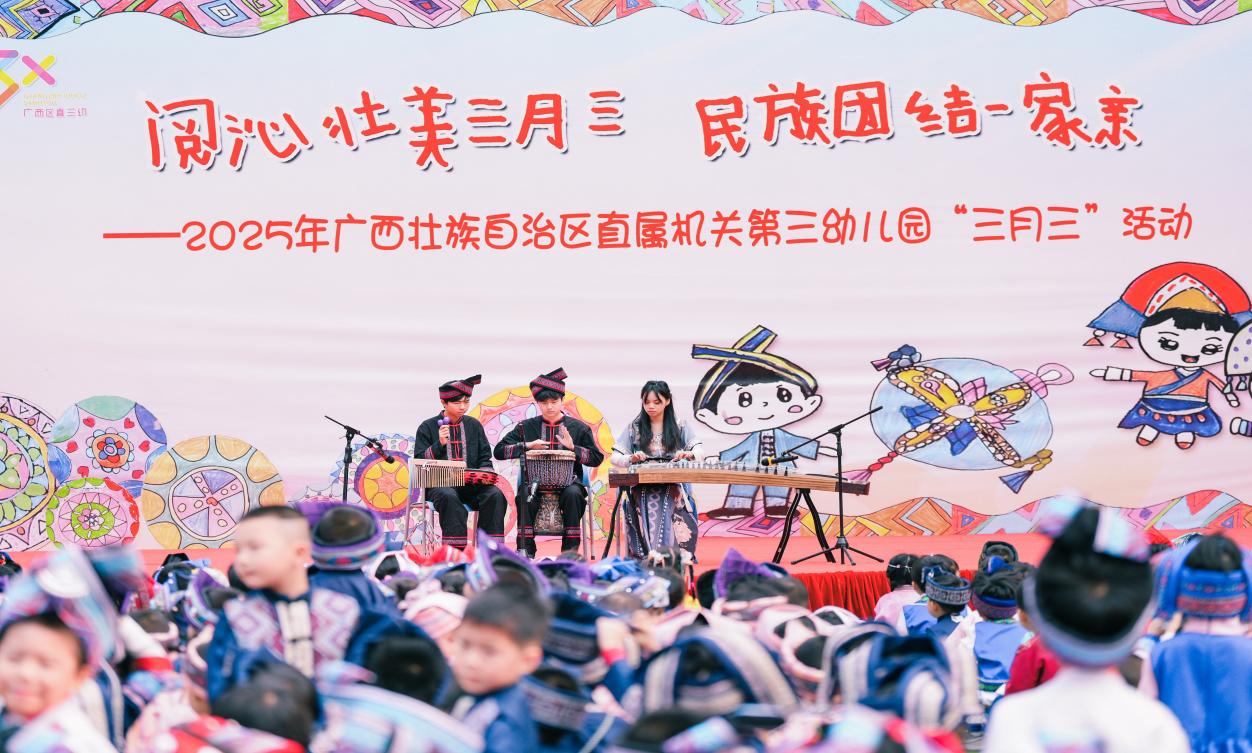 “三月三”期间,学校师生还受邀走进自治区直属机关第三幼儿园,为孩子们带来了一场题为“阅沁壮美三月三 民族团结一家亲”的壮乡三月三文艺演出。演出在欢快的山歌表演唱《李花白莲莲》中拉开帷幕,随后,器乐合奏《春苗》以清新灵动的旋律,为孩子们带来了一场别具一格的听觉盛宴。杂技节目《女子造型-春蕾绽放》凭借惊险的技术动作和惟妙惟肖的造型组合,将演出氛围推向高潮,引得台下师生阵阵惊叹。女子群舞《幸福的脚步》以明朗的节奏和整齐划一的动作,诉说着壮乡人民的生活变迁和对未来的美好憧憬,赢得了全场热烈的掌声。