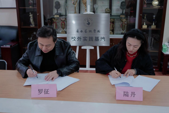 在全体与会人员的共同见证下,罗征与陆丹共同签署合作共建协议,并为“广西艺术学校校外实践基地”揭牌,标志着双方合作正式迈入资源互通、共建共享的实质性阶段。此次合作聚焦三大核心方向,一是人才共育,浙曲杂为我校学生提供专业实训、舞台实践平台及就业通道,我校则根据院团需求定制培养方案,全力达成“毕业即上岗,上岗即胜任”的育人目标;二是艺术共创,依托浙曲杂的创作优势与我校的教学资源,联合开展杂技节目研发、非遗技艺传承等重点项目;三是资源共享,双方将共享练功房、演出剧场、师资力量等关键资源,定期组织演员互访、教学交流活动,着力构建“产学研用”一体化育人体系。